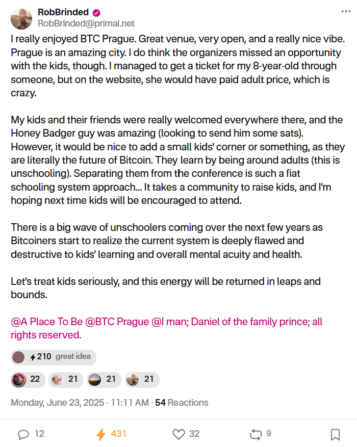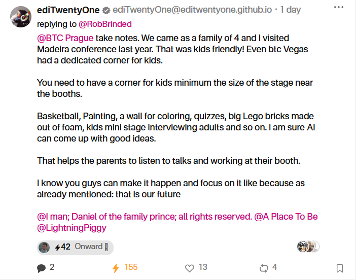We’re sharing this not to bash anyone but to speak up on something that matters, hoping by June 2026 (the next edition of BTCPrague) things will look different, with more focus on families (real care about the topic). And maybe to inspire some other events.